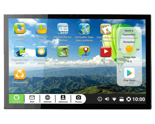 La tablette Ordissimo Celia met la lisibilité au centre : gros boutons, menus très clairs et un accueil unique qui évite de se perdre dans les réglages. Les principales fonctions (Internet, Photos, Messages, Visio) sont accessibles en un geste.