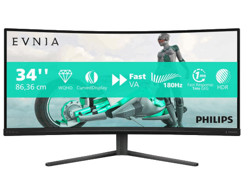 Le Philips Evnia 34M2C3500L combine une dalle VA incurvée de 34 pouces (1500R) et une définition 3440×1440 pixels pour un affichage immersif. Son taux de rafraîchissement de 180 Hz et son temps de réponse rapide assurent une image fluide, idéale pour les jeux compétitifs.